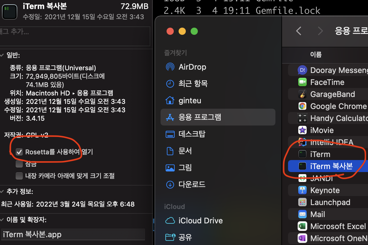 우선 Rosetta 를 사용한 terminal 을 위해 iterm을 복제하여 Rosetta 옵션을 체크해줬습니다.